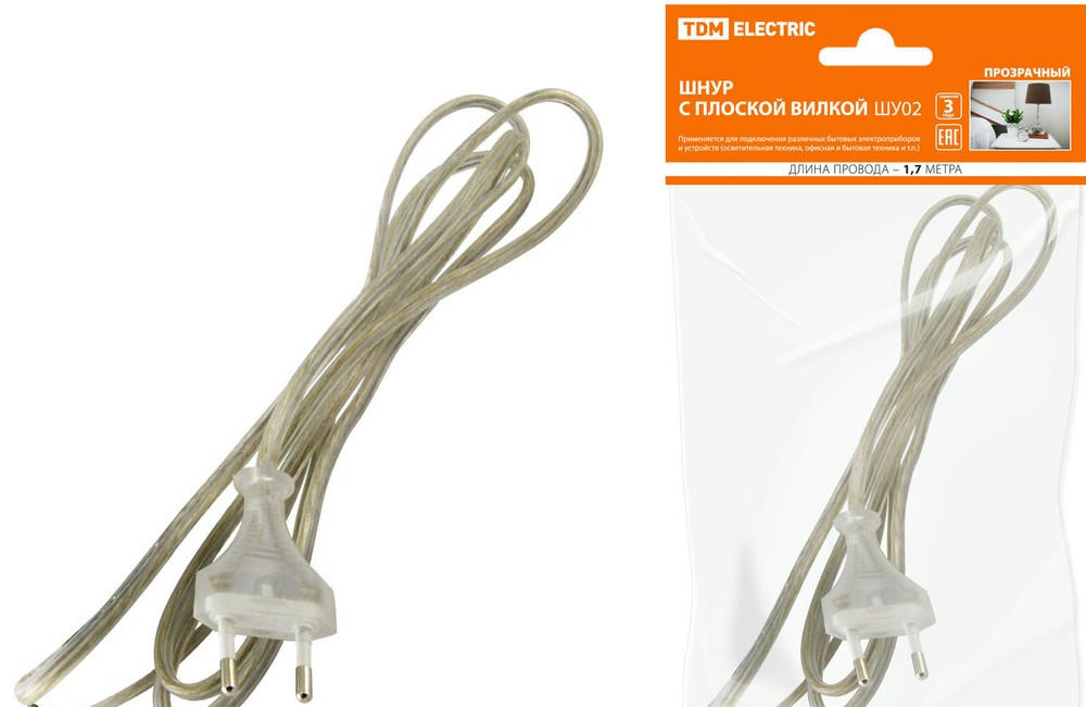 Шнур с плоской вилкой ШУ02 ШВВП 2х0,75мм2 1,7 м. прозрачный TDM